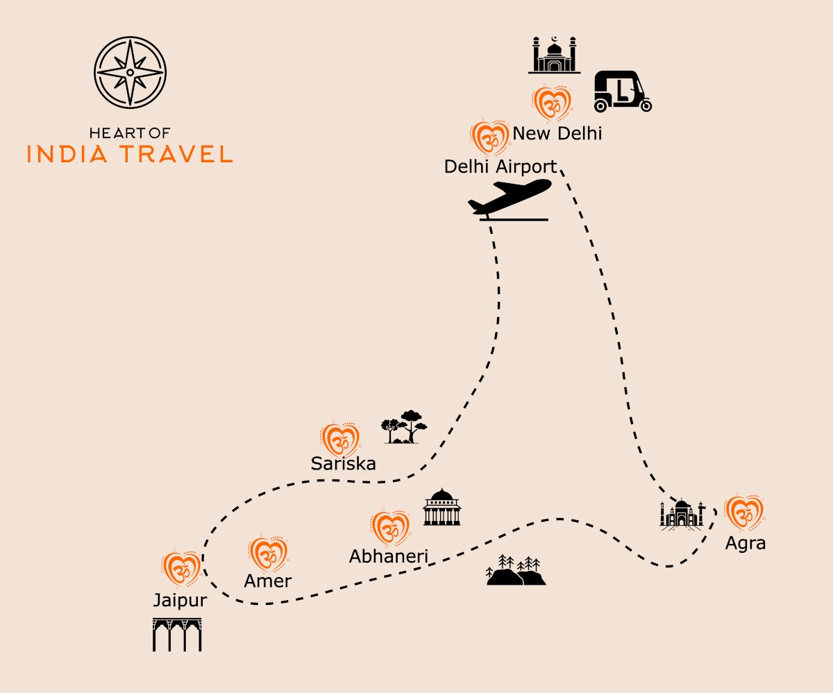 Votre aventure commence par un vol depuis votre aéroport d’origine à destination de Delhi, la vibrante capitale de l’Inde.